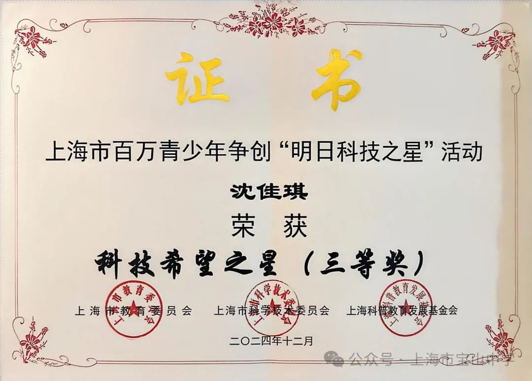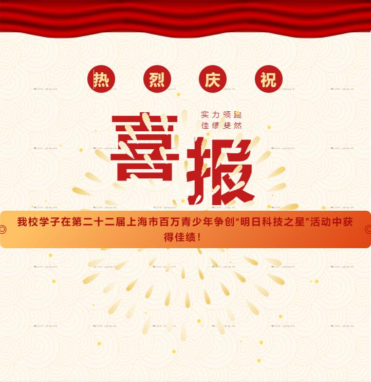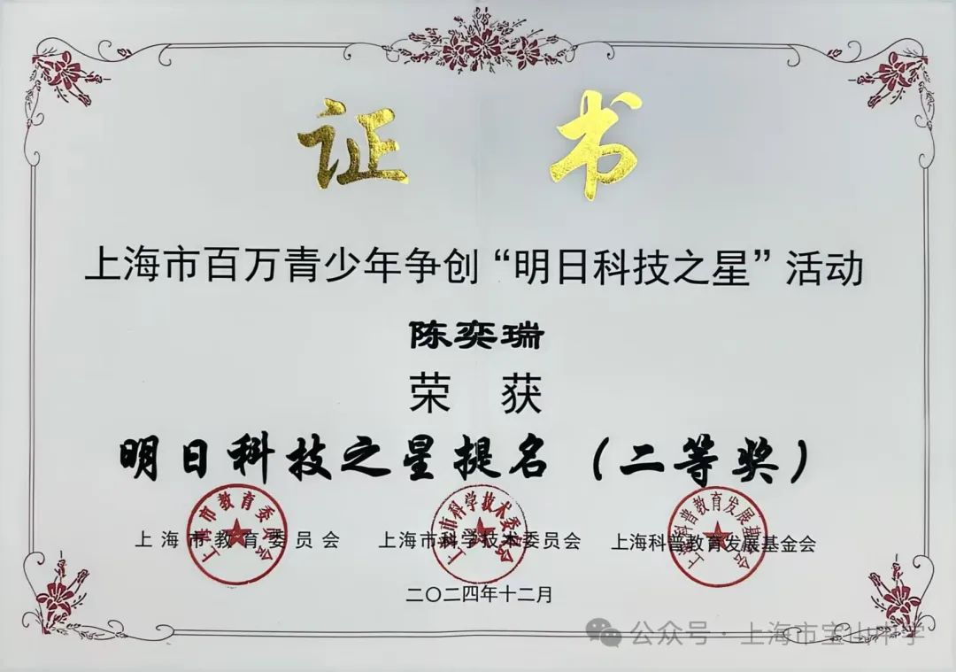 上海市青少年“明日科技之星”评选活动是市级品牌项目,上海市综评赛事、全市青少年科技竞赛领域最有含金量的奖项之一。我校高三2班陈奕瑞同学和高二1班沈佳琪同学在指导教师的帮助下,分别获得了明日科技之星提名、科技希望之星。
