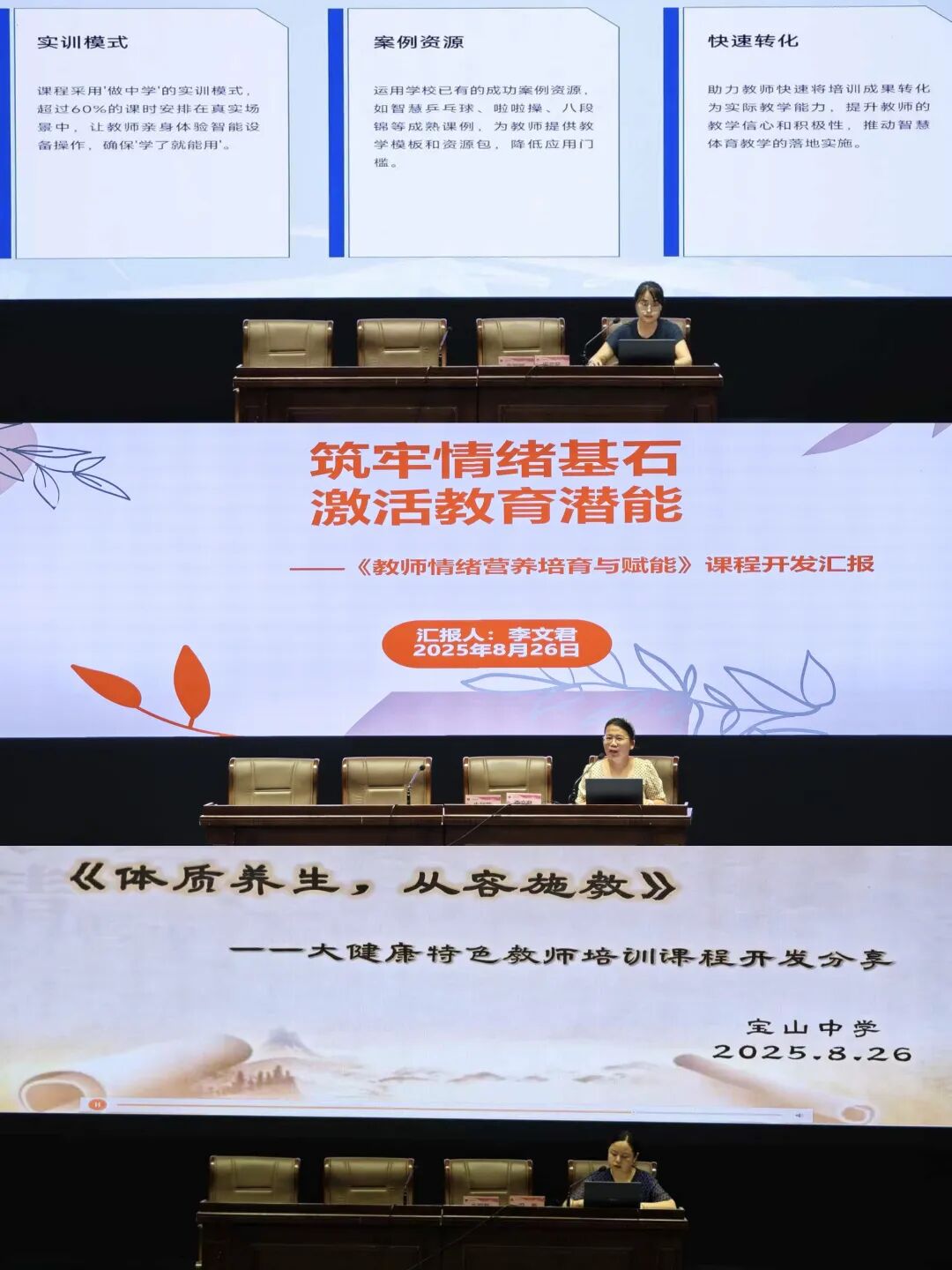 骄阳似火热,热浪翻天涌,2025年8月27日,上海市宝山中学为期两天的暑期教师培训告一段落。在信息化、数字化、智能化快速发展的今天,宝山中学紧跟时代潮流开展了一场以“数字赋能 焕发学生健康生活力”为主题的专题培训,在专家的指导下、同侪的分享中,宝中老师启迪智慧、融通教学、摩拳擦掌,开启了新学期数字赋能大健康教育育人的新征程。