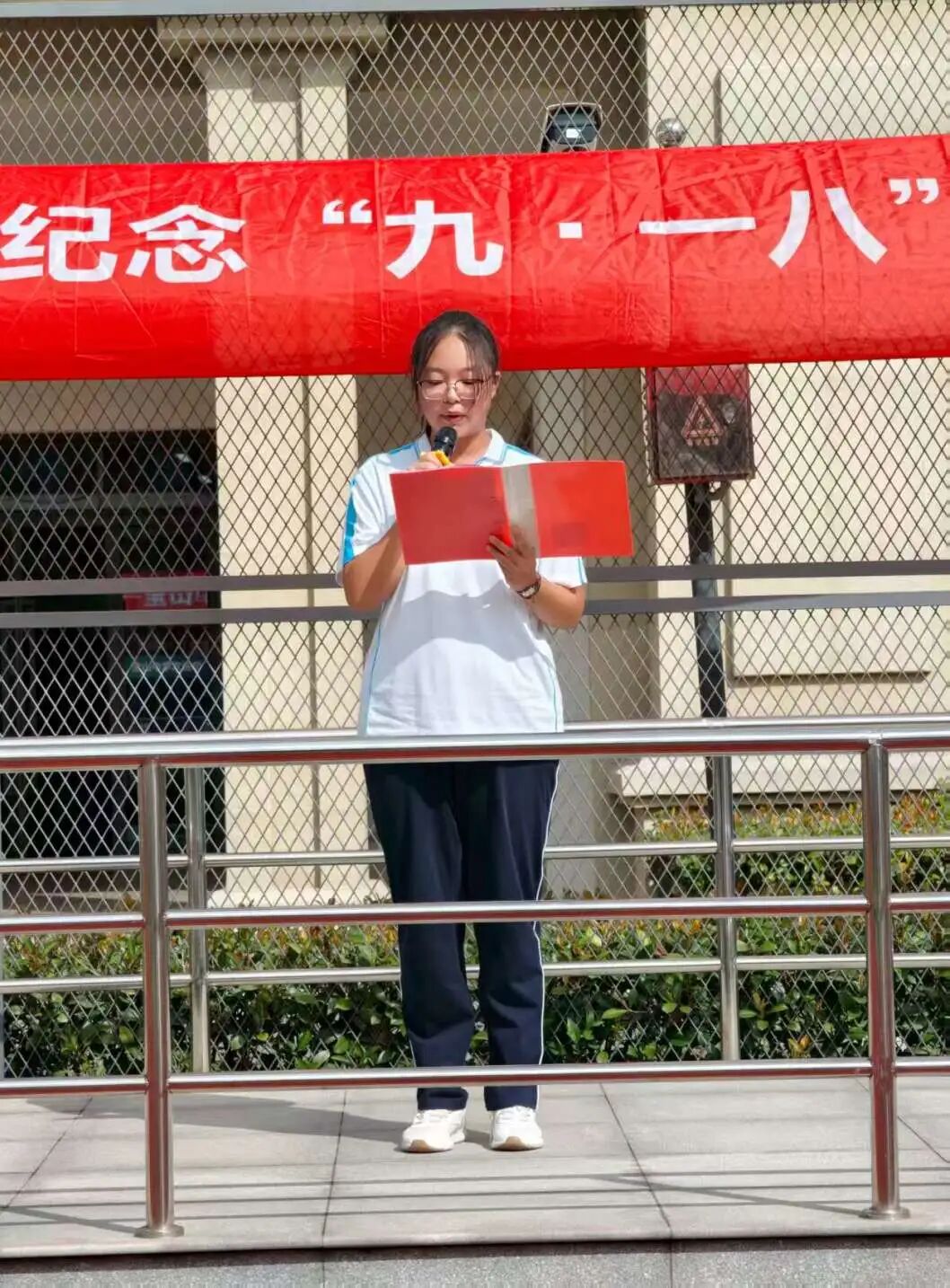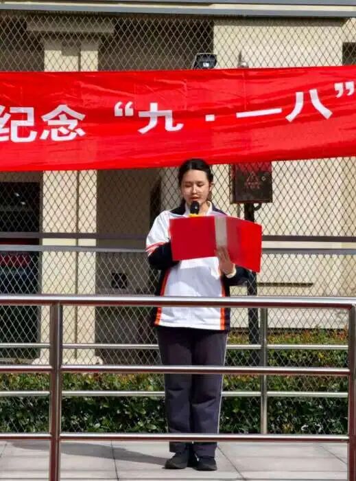 疏散至操场后,主题活动开始,活动由高三(2)班赵雨乔主持。学生代表高一(2)班孙伟祺在发言中回顾“九一八”历史,强调“勿忘国耻,绝不是要延续仇恨,而是要铭记历史”,呼吁同学们珍惜今日来之不易的和平,将爱国之情化为报国之行,体现在端正的学习态度上、对知识的渴求中、锤炼品德与强健体魄的自觉行动里,未来为祖国的繁荣富强添砖加瓦。