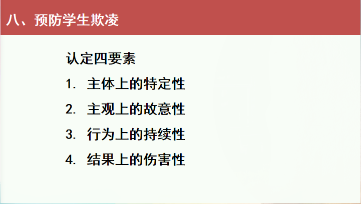 其次,关于“学生欺凌防治教育”方面,她分别从学生欺凌的概念、认定要素、如何预防、相关处置等方面作了细致的讲解。