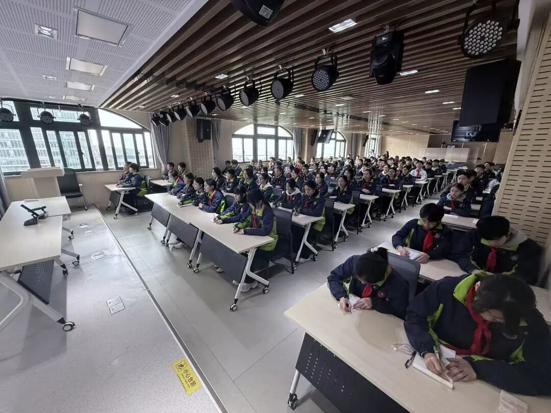 随后,德育管理中心副主任孙晋老师作了关于初中部行规教育的主题发言。她结合百年宝中的育人传统,从爱护公物、尊师重道、同学交往、作业规范等方面提出具体要求,重点强调了规则意识与文明素养的养成。她指出,宝山中学的学子,应当有“不以规矩,不成方圆”的自觉,更要有“己所不欲,勿施于人”的修养。规则是学校对每一位学生的保护,更是百年学府对每一位学子的期待。全体同学认真聆听,不时记录要点,会场秩序井然。
